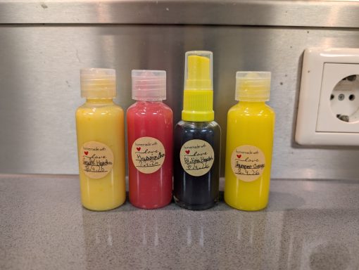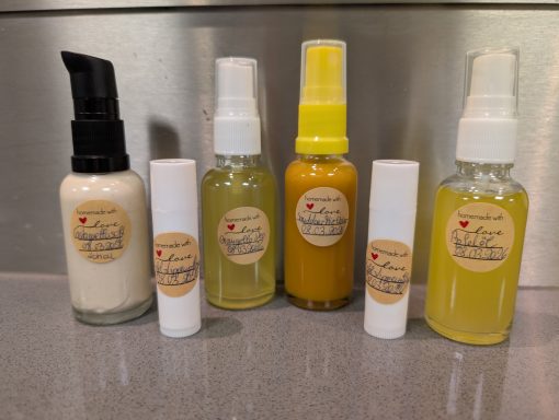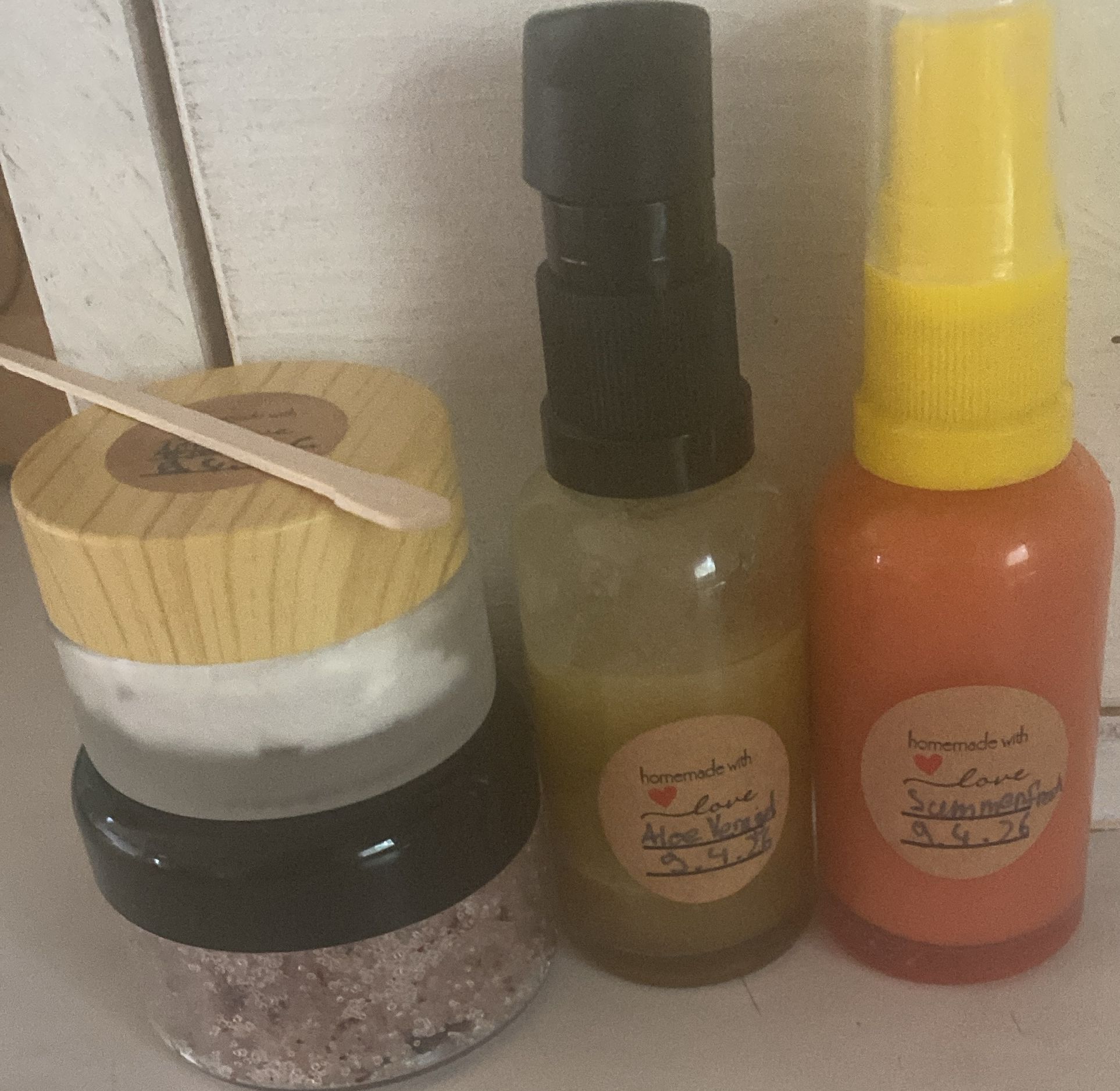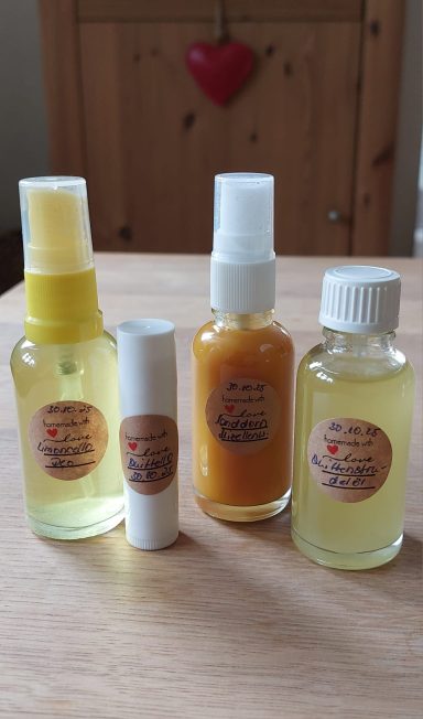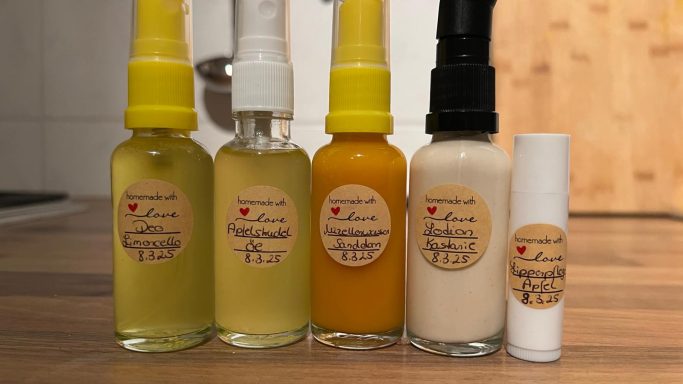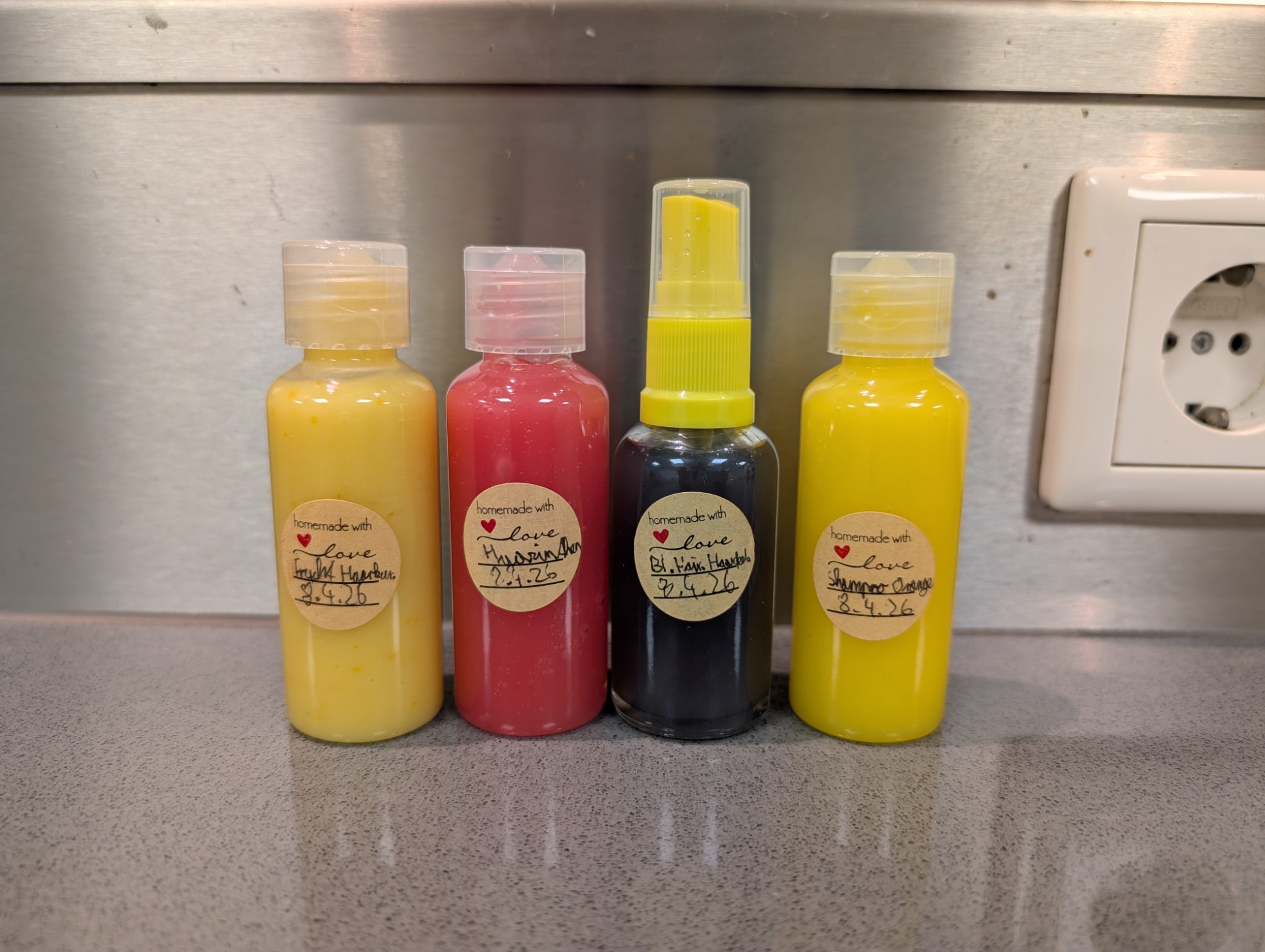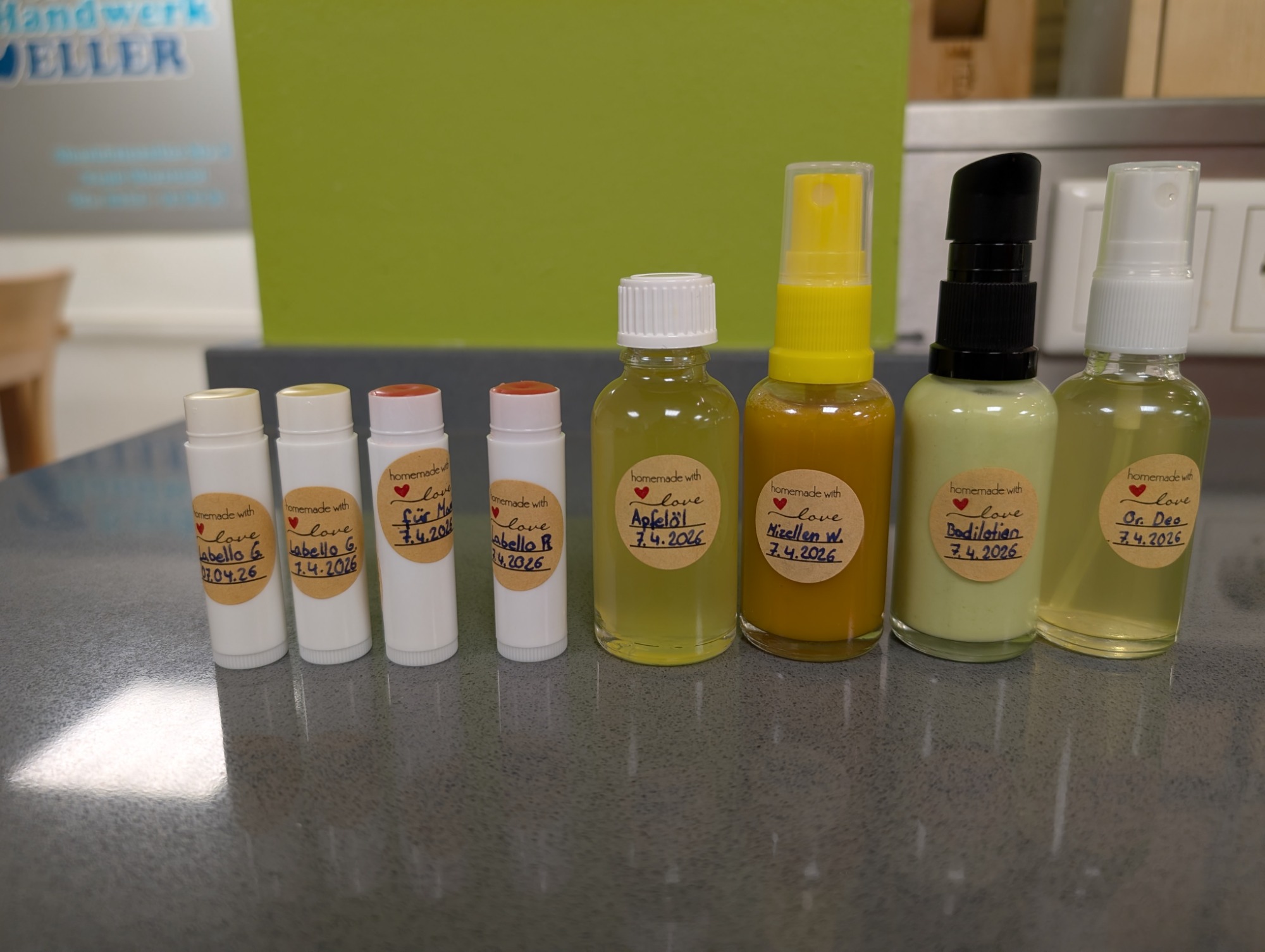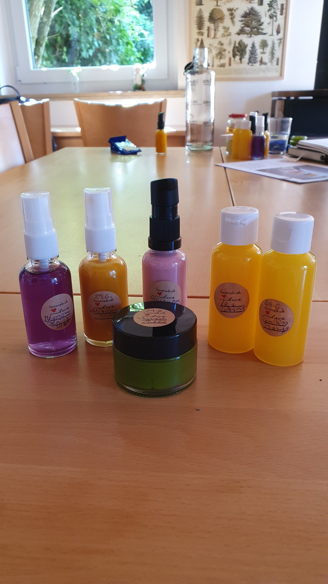 In einem Ganztagesworkshop zum Thema "Schadstoffe in käuflicher Kosmetik" im März 2025 wurden viele, farbenfrohe Grüne Kosmetik Produkte hergestellt.